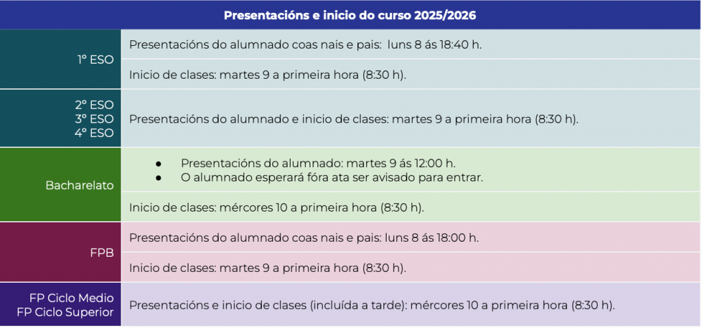 Presentacións do alumnado e inicio de clases: mércores día 10 a primeira hora (8:30h). Ese día xa haberá clases pola tarde.